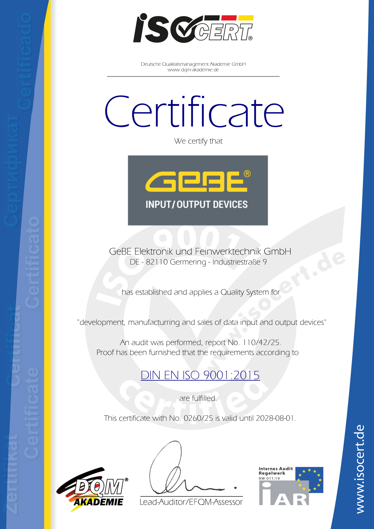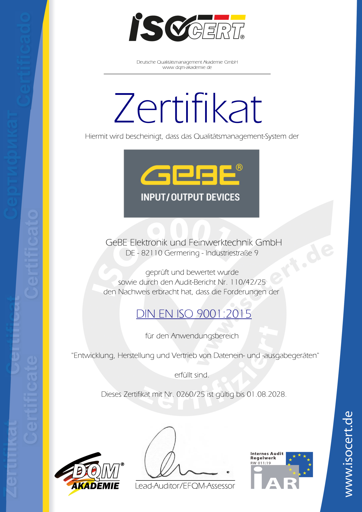 | Die Qualität der GeBE Produkte und Dienstleistungen sind nach der DIN EN ISO 9001:2015 Norm messbar und machen damit das Unternehmen für einen größeren Kundenkreis EU- und weltweit noch attraktiver. | |