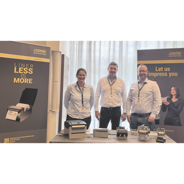 | GeBE befasst sich seit gut sechs Jahren intensiv mit den Herausforderungen des Bedruckens selbstklebender Thermopapiere ohne Trägermaterial. Inzwischen bietet das Unternehmen neben verschiedenen linerless Thermodruckern und -abschneidern auch eine patentierte Linerless-Presenter-Einheit zur adhäsionsfreien Label-Ausgabe an. GeBE Produktmanagerin Petra Faßbender und Vertriebsleiter Andreas Krüger präsentierten den Fachleuten aus aller Welt die Palette der GeBE Linerless Technology-Produkte vor Ort. Als Fachmann für Linerless Thermodruck trug Klaus Baldig, Entwicklungsleiter bei GeBE, außerdem zu einer der Diskussionsrunden bei. | |