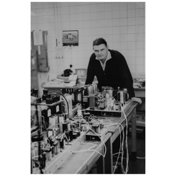 | Die Anfänge: Gert Breidenbach beim Versuchsaufbau seiner Ingenieursarbeit 1962 (Firma Radium), 1965 gründet er das Ingenieurbüro GeBE (Gert Breidenbach Elektronik). | |